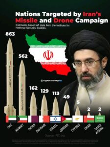 The barrage is believed to be part of Iran’s response to the ongoing regional conflict involving the United States and Israel. Military analysts say Tehran’s strategy appears aimed at striking locations linked to Western military infrastructure and strategic energy facilities spread across the Gulf and Eastern Mediterranean.