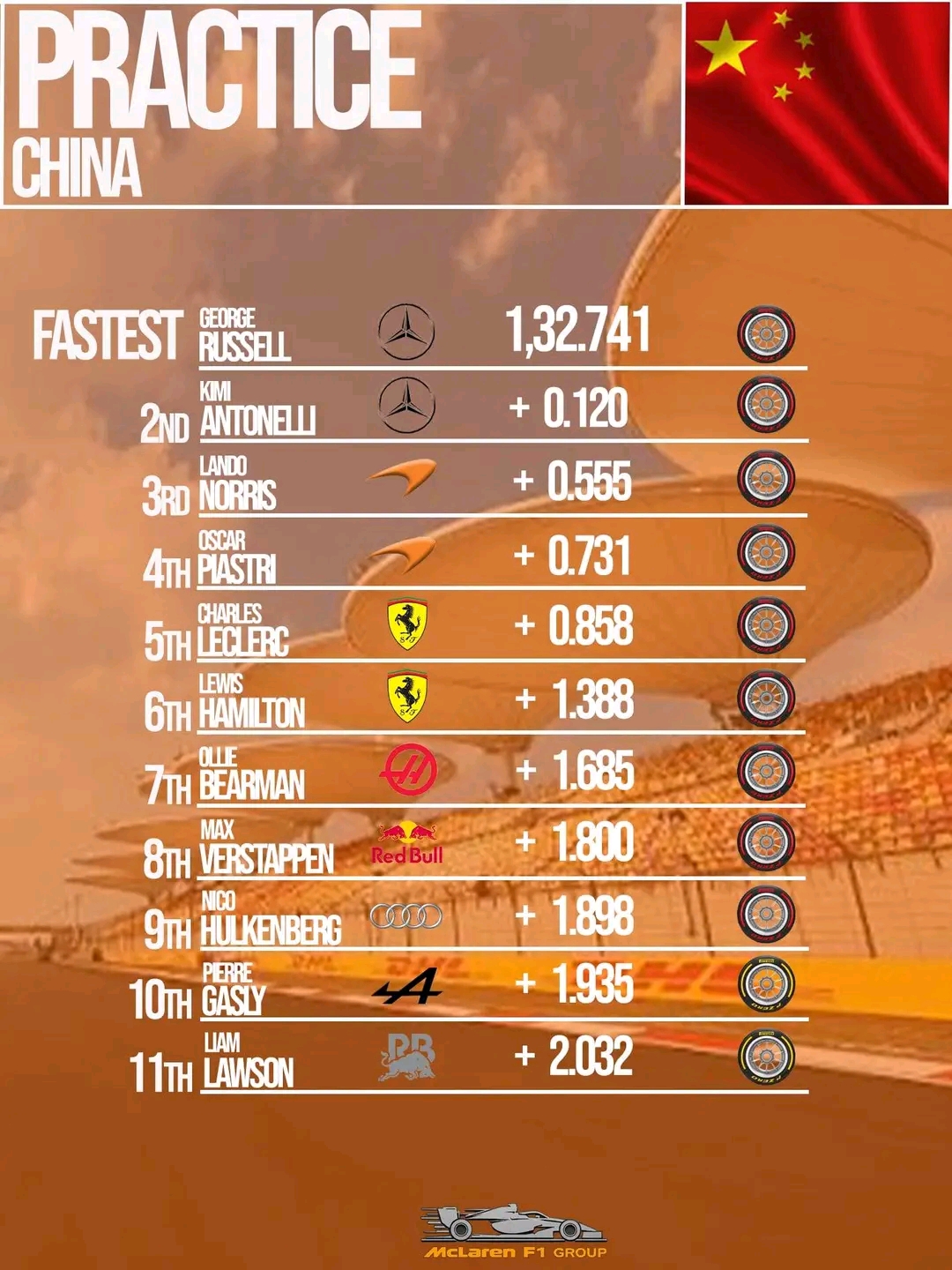 With the only practice session now complete, attention quickly shifts to the upcoming competitive action at the Chinese Grand Prix. Mercedes’ impressive pace has suddenly positioned them as one of the teams to watch, while rivals like McLaren and Ferrari will be working urgently to close the gap. As Sprint Qualifying approaches, the big question remains whether Russell can maintain his advantage—or whether Antonelli or one of the chasing teams will step up and turn the weekend into an even more dramatic battle.