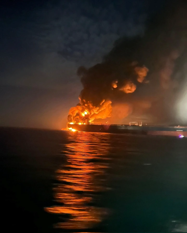 The tanker, reportedly connected to a U.S.-based energy shipping company, was carrying crude oil when the incident occurred. Crew members immediately initiated emergency protocols while nearby vessels and regional coast guards responded to distress signals. One crewman was confirmed dead, while multiple others were treated for burns and shrapnel injuries.